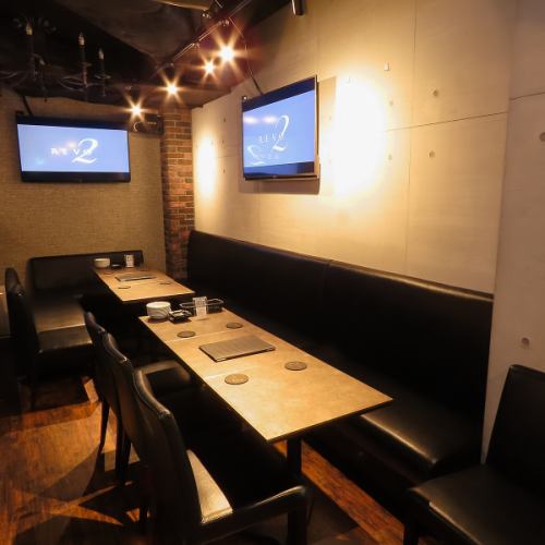 【仲間と楽しめるテーブル席】席は連結可能!4名様掛け×2と2名様掛け×1のお席は連結可能となっておりますので、広々とした落ち着いた雰囲気の空間で、友人との集まりに最適です。シックなテーブルに壁には大画面のテレビがあり、仲間とカラオケでワイワイ楽しむのにぴったりな空間です。